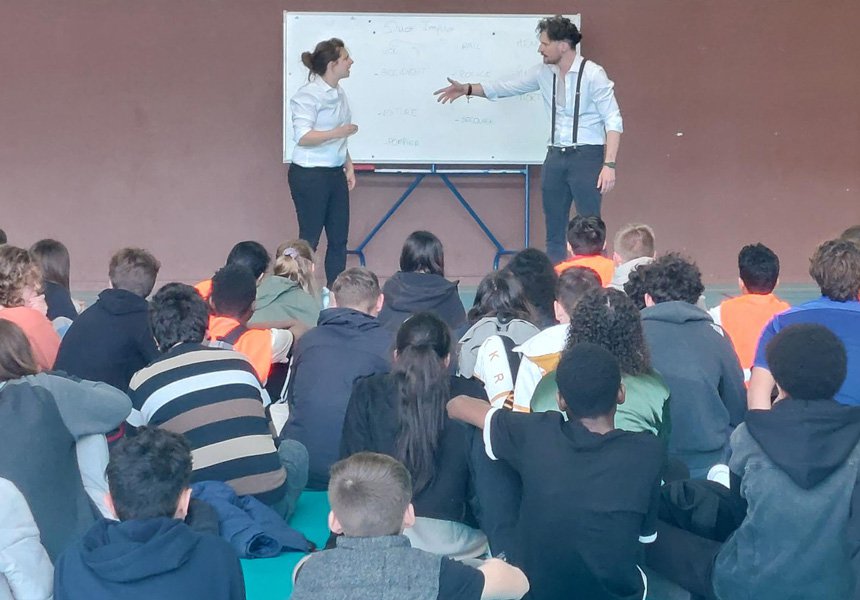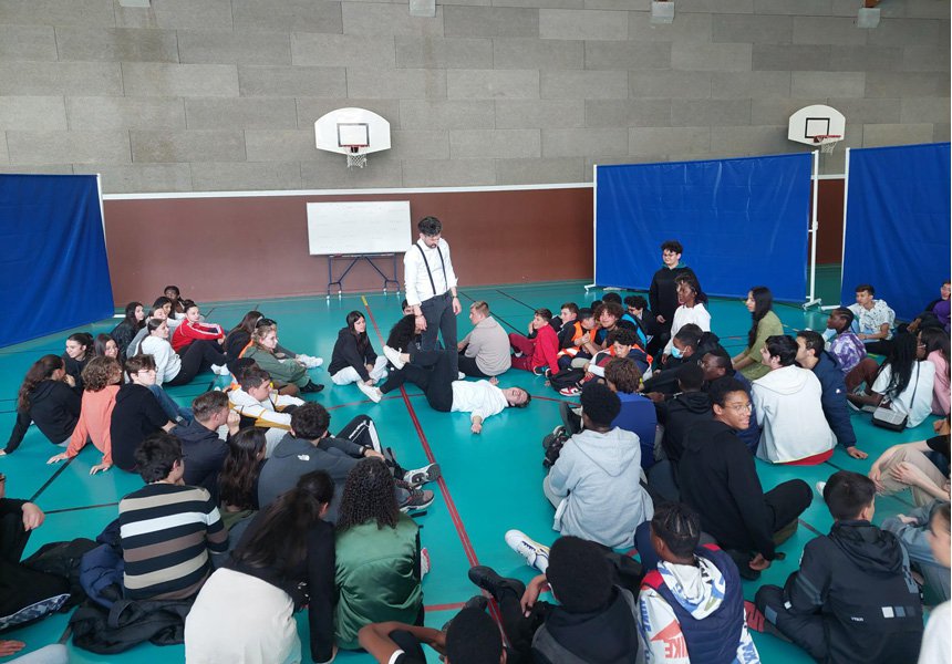 Après les différents échanges entre les élèves et la troupe « Le Mitch impro », les deux comédiens ont terminé l'après-midi au sein du gymnase avec une improvisation théâtrale participatif très apprécié par les collégiens.